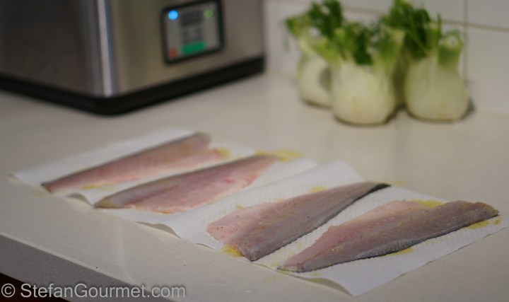 Salate la pelle dei filetti. Salate e pepate l’altro lato e spennellatelo con un po’ di olio extra vergine di oliva. Normalmente non metto l’olio per sous vide, ma in questo case serve per evitare che la polpa del pesce si attacca alla busta. Meglio se un buon olio leggero, per non coprire il sapore del branzino.