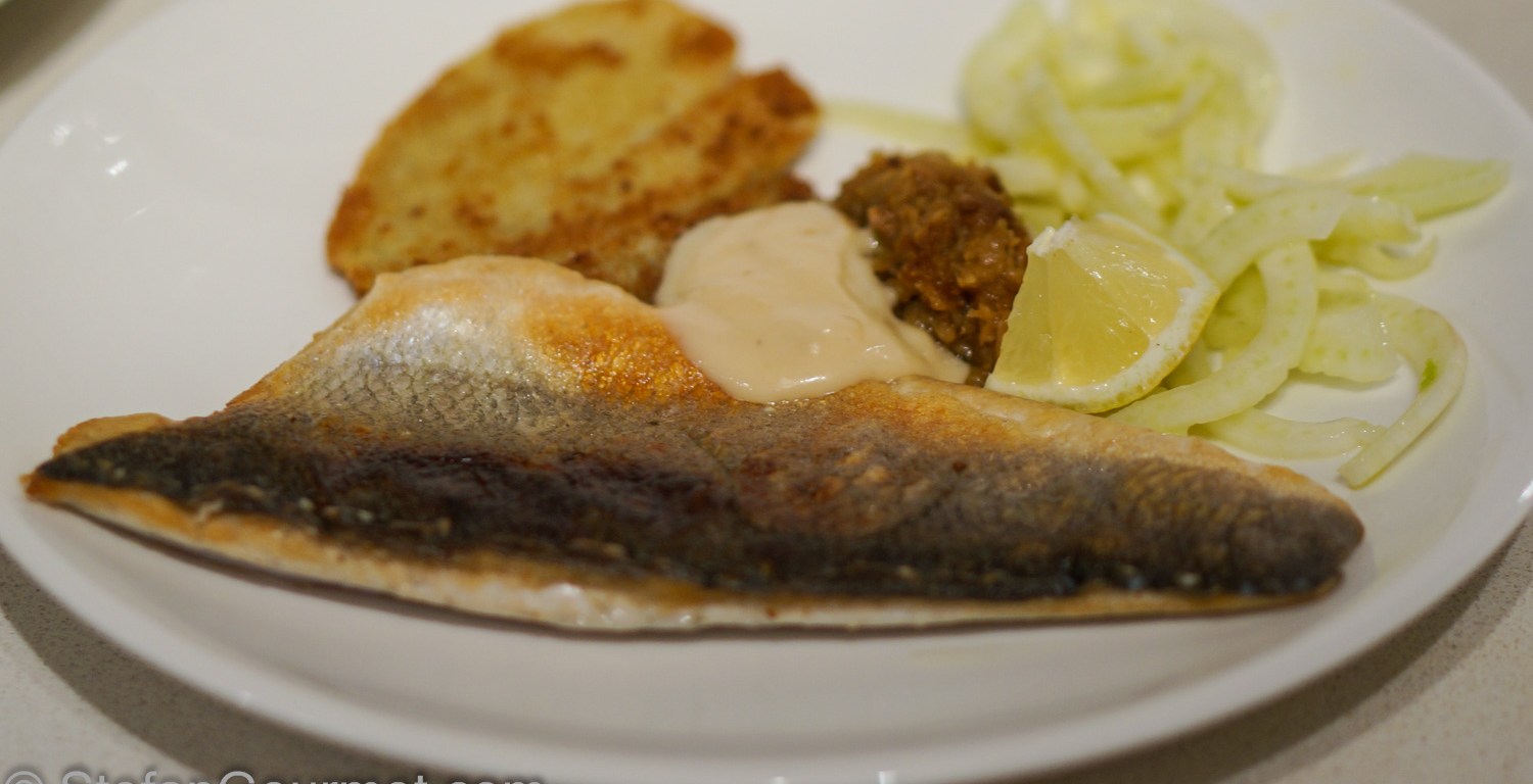 Dopo tanti sperimenti ho trovato la temperatura giusta per cuocere a bassa temperatura il branzino e il migliore metodo per far croccante la pelle. Ci vuole un po’ di farina e del burro chiarificato. Va bene anche l’olio di oliva, però la pelle diventerà più croccante con burro chiarificato. Burro normale brucerebbe perché ci vuole rosolare la pelle su fuoco altissimo.