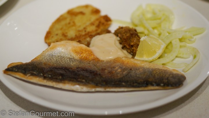 In questa foto ho aggiunto un tris di finocchio: insalata di finocchio, finocchi dorati e finocchio brasato. La salse è una riduzione di un brodo fatto con gli scarti del branzino.